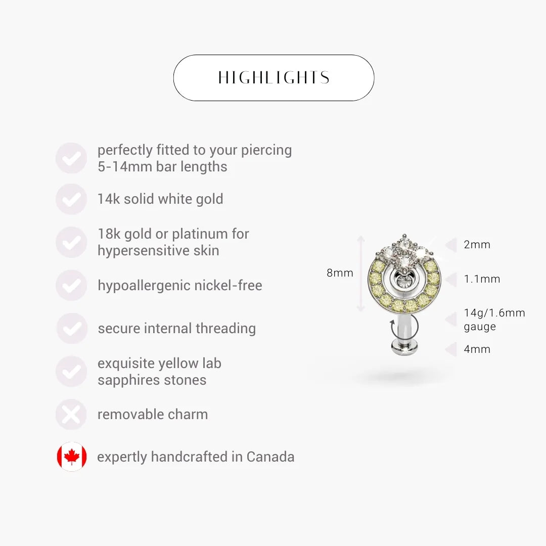 Order it with a standard bottom disk or a striking matching yellow pave disk. For a flawless fit, consult our Piercing Concierge to ensure it’s tailored to your unique navel anatomy. With adjustable bar lengths from 5mm to 14mm, we guarantee a perfect fit—the right fit is everything.