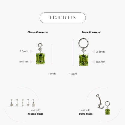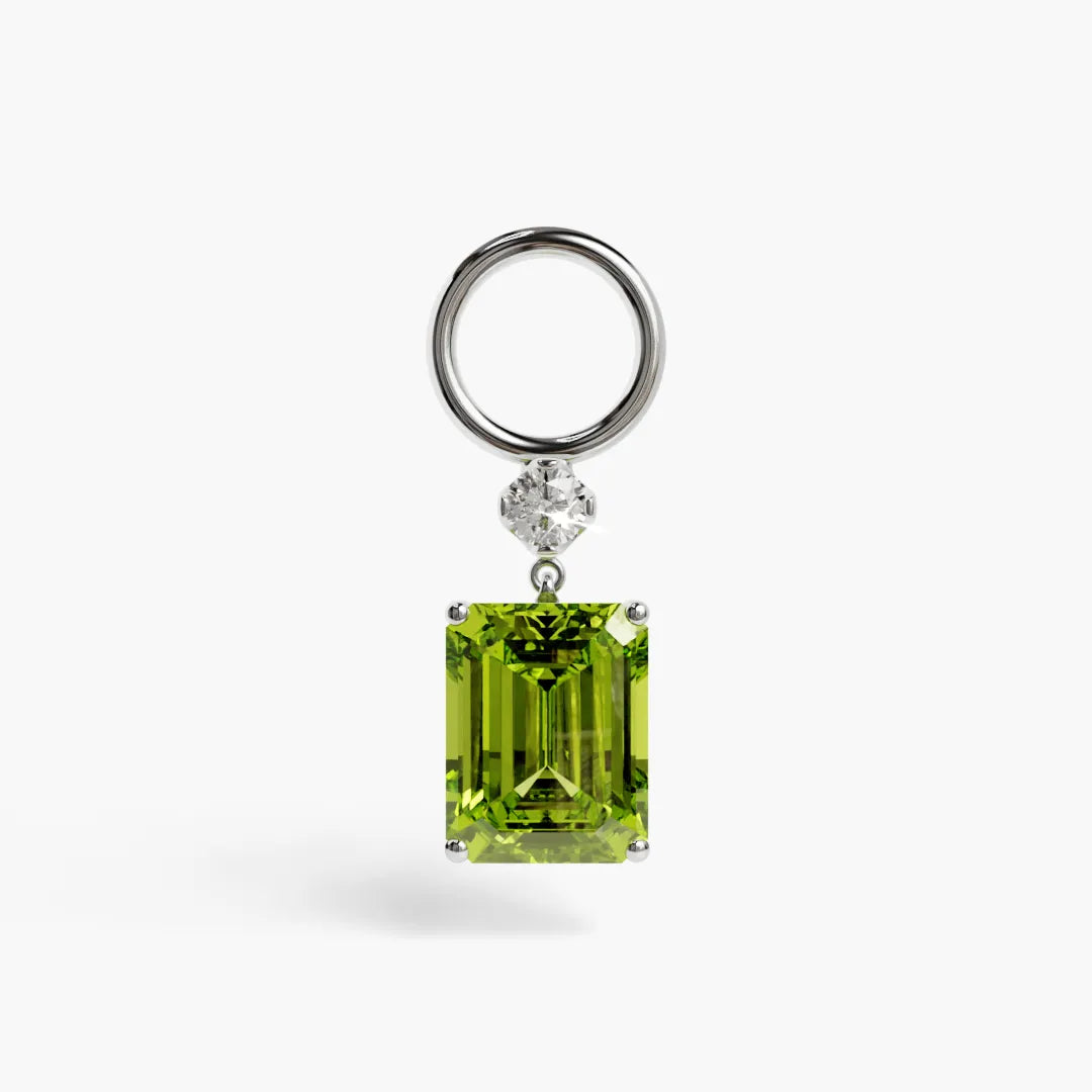 An emerald-cut Peridot demands attention, stacked beneath a crisp white moissanite in our signature Orchid setting. Bright, punchy, and unapologetically different. Clip it on when the look needs something unexpected.