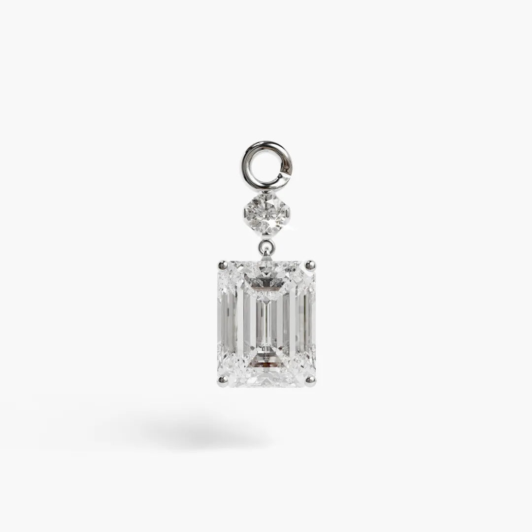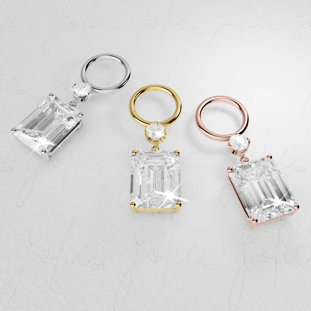 An emerald-cut moissanite takes the spotlight, stacked beneath a matching white stone in our signature Orchid setting. Sleek, crisp, and cut with intent. Clip it on when the look calls for precision and presence.