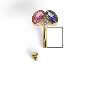 This floating navel ring pairs the soft blush of pink moissanite with the deep blue of lab-grown sapphire in a striking toi et moi setting. A clear stone separates the two, enhancing the beautiful contrast. This lightweight design sits comfortably without putting pressure on your piercing, making it ideal for petite or collapsing navels, or for anyone seeking a bold yet delicate accessory.