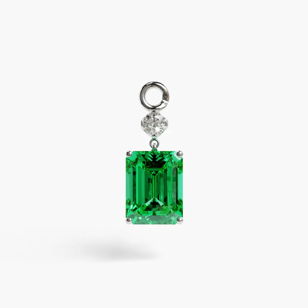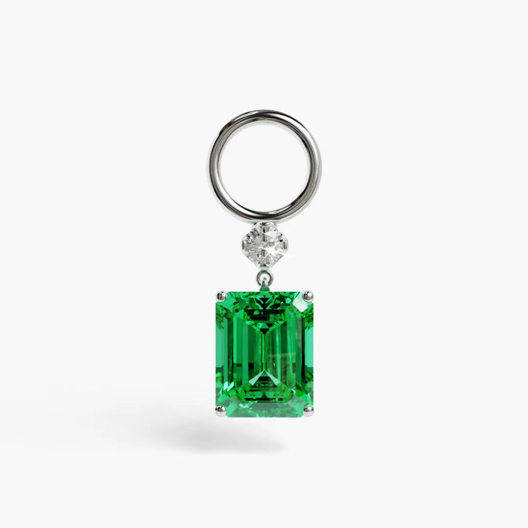 A lab-grown Emerald takes center stage, emerald-cut and stacked beneath a crisp white moissanite in our signature Orchid setting. Rich, striking, and built to stand out. Clip it on when subtle isn't part of the plan.
