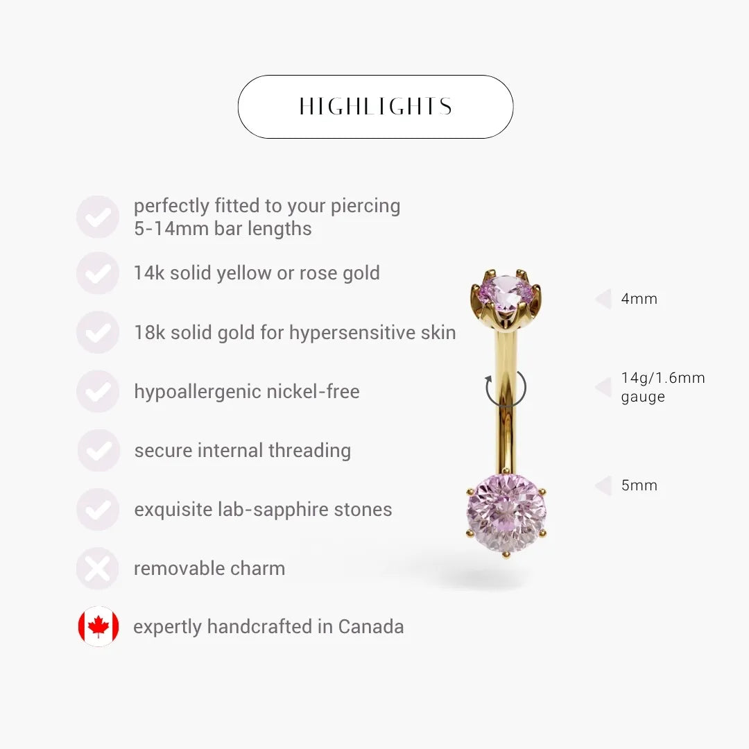 Navel jewelry is all about the finishes, a tapered design that fit snugly in your navel, so light and comfortable, it becomes a part of you. And the stones? They’re everything; they captivate, drawing attention even when you're not looking.