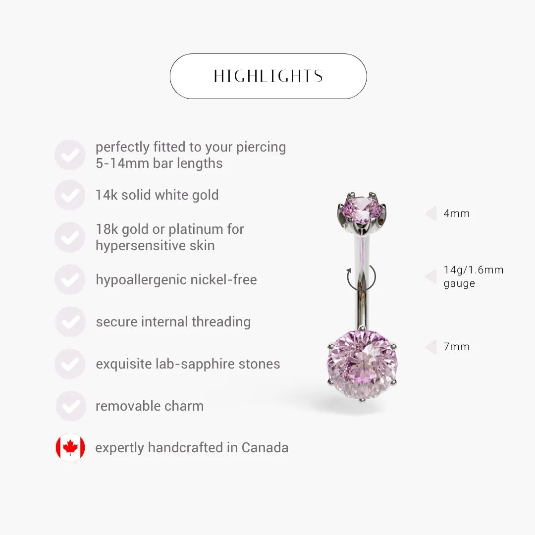 Beyond its stunning beauty, you can customize this belly ring with optional add-on charms. Pair it with a clear moissanite clip-on charm to make it the centerpiece of your outfit. When you're done, simply remove it—caring for your piercing is easy.