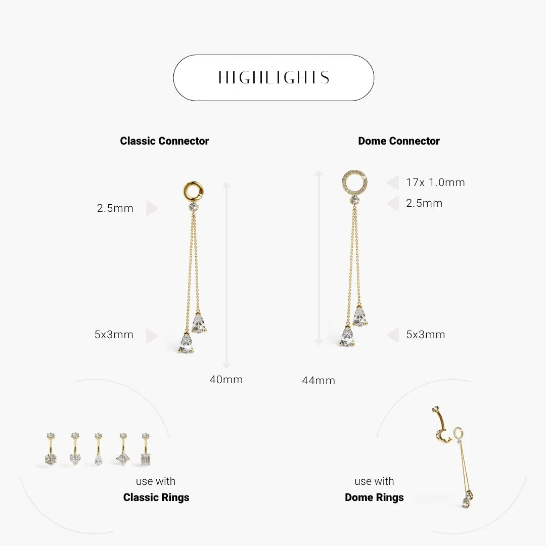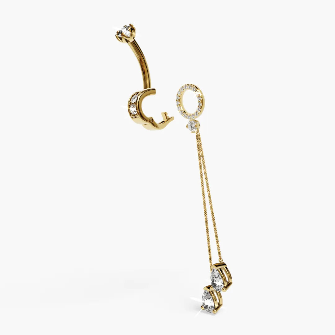 The Drop ‘Tear’ sways with twin pear-cut moissanites, catching the light with every move. Paired with a pavé halo and fine gold chains, this charm delivers soft drama with a sharp edge.