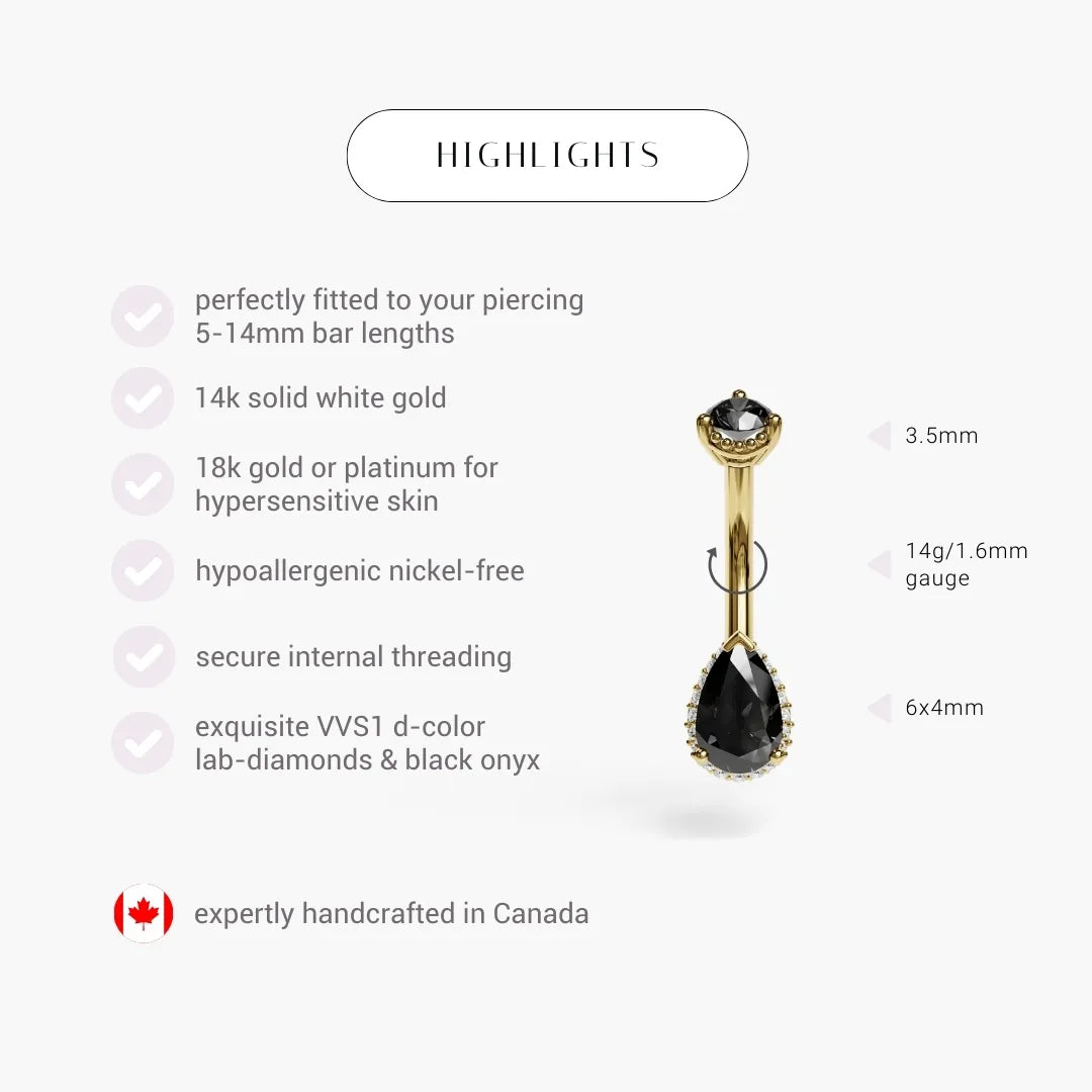 A 0.5ct black pear onyx stone set in quiet precision.